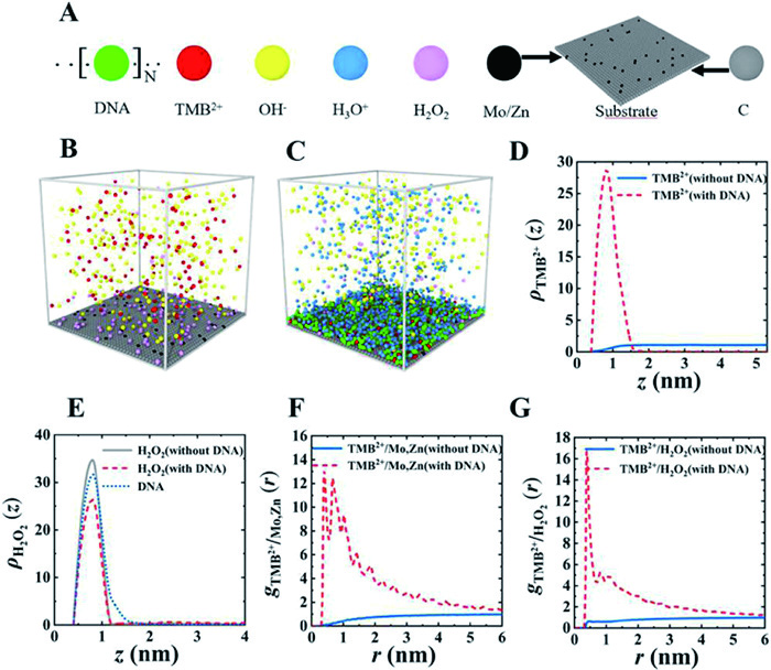 | Fig. 5. (A) Schematics of coarse-grained model for a DNA chain (in green), a TMB2+ ion (in red), an OH- ion (in yellow) as the counterion of TMB2+, an H3O+ ion (in blue) as the counterion of DNA molecule, an H2O2 molecule (in pink) and the carbon-complexed substrate (in grey) containing Mo-Zn atom (in black). Typical snapshots of coarse-grained MD simulations of mass-transfer process of TMB onto the carbon-complexed substrate (B) without and (C) with DNA additions, in which the green, blue, red, yellow, pink, black and grey beads represent the DNA, H3O+, TMB2+, OH-, H2O2, as well as Mo-Zn single-atom and carbon components in the substrate. Vertical density distribution functions of (D) TMB2+, (E) DNA and H2O2 in solution above the carbon-complexed substrate (at z = 0 nm). Radial distribution functions (F) Mo-Zn and (G) H2O2 around TMB2+ in the solution. The chain length and ionization degree of DNA are set as N = 20 and f = 1.0, respectively. | |
