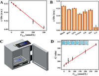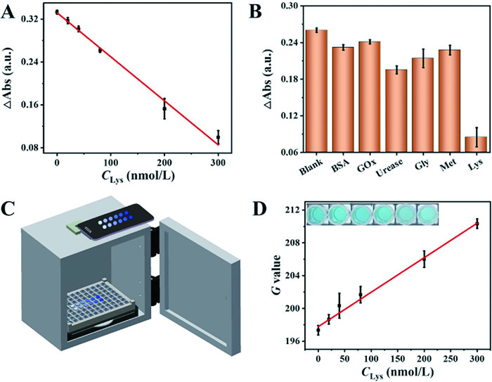 | Fig. 6. (A) Calibration curve displaying the decrease in absorbance at 652 nm as a function of increasing Lys concentration. (B) Specificity test results showing absorbance changes with various interferents (BSA, GOx, urease, glycine, methionine, and lysine) compared to a blank sample, confirming the selectivity of the sensor towards lysozyme. (C) Design of the custom imaging setup used for the colorimetric sensor, featuring a 96-well plate, LED lighting, and a smartphone holder to ensure consistent image capture. (D) Quantitative analysis correlating color intensity (G-values) obtained from smartphone-captured images with lysozyme concentrations, further confirming the linearity and practical application of the biosensor in complex sample matrices. | |