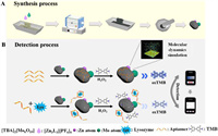 | Fig. 1. Synthesis and application of Mo-Zn SANs. (A) The synthesis process, where Mo-Zn SANs are produced from metal precursors using a poly(vinyl alcohol) aerogel, followed by controlled thermal treatment to achieve the desired nanozyme structure. (B) The application of Mo-Zn SANs in enzymatic colorimetric assays, detailing the oxidation of TMB in the presence of hydrogen peroxide. It also demonstrates the interaction with the lysozyme aptamer (LA) and lysozyme (Lys), highlighting enhanced catalytic activities through molecular dynamics simulations that clarify the mechanism behind activity augmentation. | |