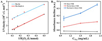 | Fig. 4. (A) Lineweaver-Burk plots summarizing the inverse velocity (1/V) against the inverse concentration of H2O2 (1/[H2O2]) for both Mo-Zn SANs and Mo-Zn@LA, derived from data in Figs. S3C and S3D. (B) Evaluation of the decline in TMB absorbance in response to increasing concentrations of tryptophan (Try), acting as a singlet oxygen (1O2) scavenger, across three systems: H2O2 + TMB, Mo-Zn + H2O2 + TMB, and Mo-Zn@LA + H2O2 + TMB. This graph illustrates the comparative effectiveness of Try in mitigating the oxidation of TMB, highlighting the varying influence of the Mo-Zn and Mo-Zn@LA catalysts on the reactive oxygen species involved in the oxidation process. | |