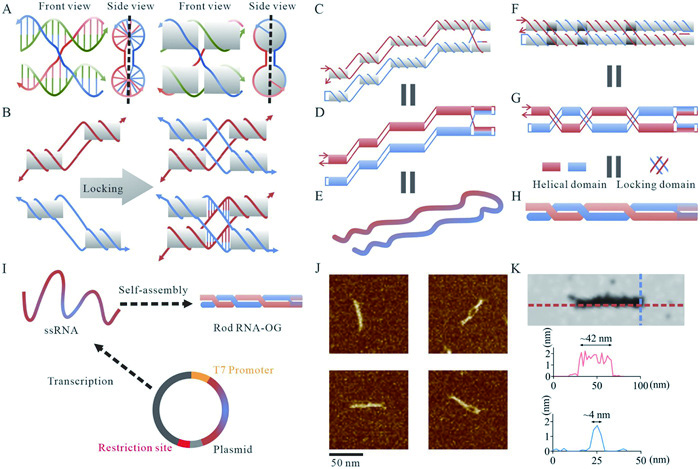 | Fig. 1. Design and synthesis of Rod RNA-OG. (A) Schematics of the PX designs. The central plane is marked by dashed lines in the model. (B) Schematics illustrating the complete formation of a locking domain through base pair recognition. (C-E) Models of double-stranded intermediate structures of Rod RNA-OG. Models of fully formed structures of Rod RNA-OG. (E, H) Pipeline-style models visualizing the folding pathway of the intermediate structure. The model is colored with a gradient, where the 5′ and 3′ ends of the ssRNA are represented in red and the middle portion is shown in blue. (I) Workflow of Rod RNA-OG synthesis. Linearized plasmid containing origami sequences is transcribed into ssRNA, and then self-folds into Rod RNA-OG after annealing in PBS buffer. (J, K) AFM images and the corresponding length, width and height of Rod RNA-OG. | |