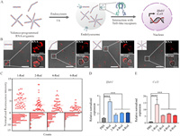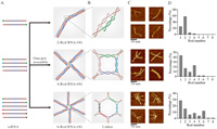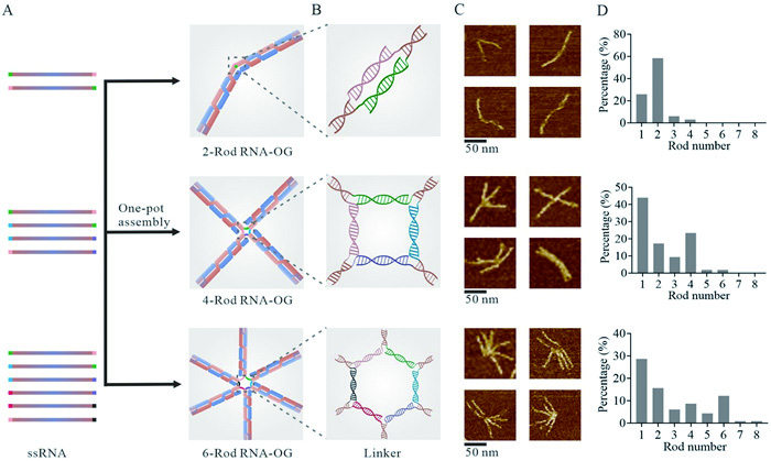 | Fig. 2. Synthesis of polyvalent RNA origamis. (A) ssRNA strands, transcribed from linearized plasmids containing origami sequences and sticky ends, assemble into polyvalent RNA origamis after annealing in PBS buffer. The models of 2-Rod, 4-Rod and 6-Rod RNA-OGs with increasing rod numbers from up to bottom are shown on the right. (B) Schematics of the linkers in the structures of 2-Rod, 4-Rod and 6-Rod RNA-OGs. (C) AFM images of polyvalent RNA origamis. Scale bar: 50 nm. (D) Histograms showing the distribution of the rod numbers of each designed polyvalent RNA origami. | |