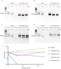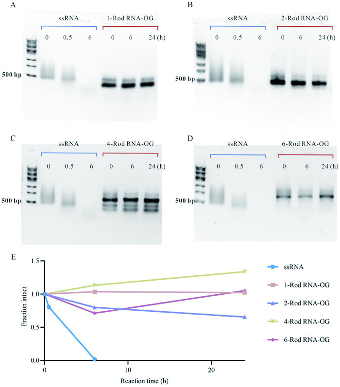 | Fig. 3. Enzymatic stability of polyvalent RNA origamis. (A-D) Agarose gels demonstrating the stability of 1-Rod RNA-OG, 2-Rod RNA-OG, 4-Rod RNA-OG and 6-Rod RNA-OG under the treatment with RNase A (1 μg/mL, in 1× PBS buffer, pH 7.4) at 37 ℃ for 0.5, 6 and 24 h. (E) The fraction intact is calculated by the gray value ratio of the RNA-OG treated with RNase A to untreated RNA-OG through ImageJ. | |