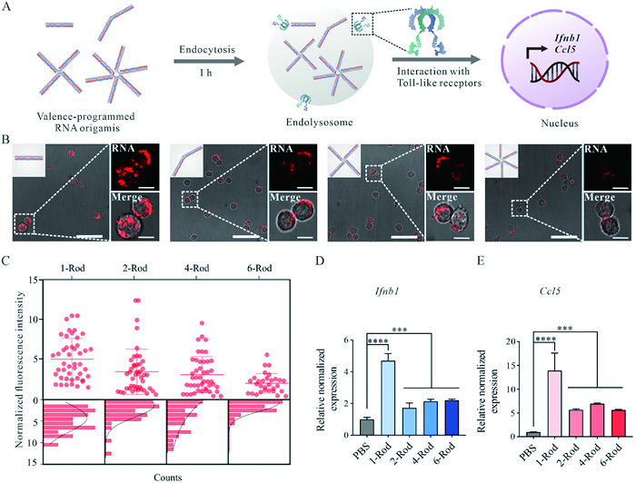 | Fig. 4. Biological effects of polyvalent RNA origamis. (A) Schematic of the interaction between TLR3 and polyvalent RNA origamis in vivo. (B) Confocal fluorescence microscopy images depict RAW 264.7 cells treated with polyvalent RNA origamis, from left to right: 1-Rod, 2-Rod, 4-Rod and 6-Rod RNA-OGs, respectively. The scale bars in the zoom-in images represent 10 μm, while the ones in the zoom-out images are 50 μm. (C) Statistical distribution of fluorescence intensity for each group in (B). (D, E) The mRNA expression of Ifnb1 and Ccl5 after stimulation of macrophages by polyvalent RNA origamis. All data are shown as representative of at least three independent experiments. ****P < 0.0001, ****P < 0.001. | |