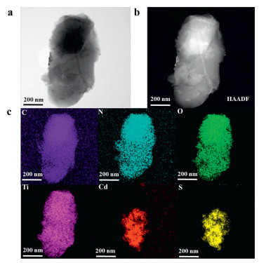 | Fig. 2. (a, b) HAADF imaging. (c) EDX elemental mapping of C, N, Ti, O, Cd, S. | |