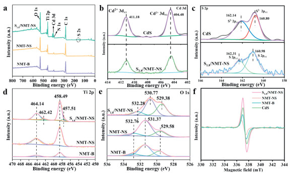 | Fig. 3. High-resolution XPS profiles of (a) survey scan. (b, c) Cd 3d and S 2p in S1.8/NMT-NS and CdS. (d, e) Ti 2p and O 1s in NMT-B, NMT-NS, and S1.8/NMT-NS. (f) EPR spectra of CdS, NMT-B, NMT-NS, and S1.8/NMT-NS. | |