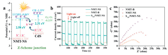 | Fig. 4. (a) Schematic description of the electronic band structures of NMT-NS and CdS. (b) Photocurrent response. (c) EIS Nyquist plots of S1.8/NMT-NS, NMT-NS, and NMT-B. | |