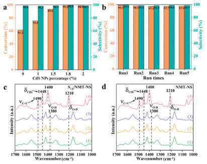 | Fig. 5. (a) Conversion for BZA and selectivity of N-BZA over NMT-NS with different loading mass of CdS clusters. (b) Cyclic test of the photocatalytic oxidation of benzylamine over S1.8/NMT-NS. In situ FT-IR spectra of (c) S1.8/NMT-NS, (d) NMT-NS. (1) After degassing at 150 ℃ for 3 h. (2) Adsorption of benzylamine for 30 min at room temperature (physisorption + chemisorption). (3) Further evacuation of excess benzylamine at 150 ℃ for 15 min under 5 Pa (chemisorption). (4) FT-IR spectra of BZO in KBr. | |
