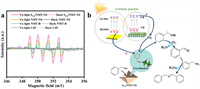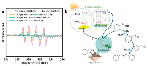 | Fig. 6. (a) EPR spectra of •O2- generated by CdS, NMT-B, NMT-NS, and S1.8/NMT-NS with DMPO. (b) Proposed mechanism of photocatalytic selective oxidation coupling of BZA and BZO over S1.8/NMT-NS under visible light. | |