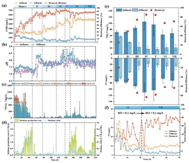 In phase Ⅵ, HRT was reduced to 18 h, resulting in an OLR increase to 6.7 kg COD m−3 d−1. The average concentrations of acetic acid and propionic acid in the effluent were 163.50 mg/L and 24.79 mg/L, respectively. The elevated organic load exceeded the metabolic capacity of the microorganisms, leading to a significant accumulation of VFAs. Consequently, the average COD removal rate decreased to 83.54%. The average removal rate of NH4+-N and TN also decreased to 67.21% and 62.12% (Figs. 1e and f), respectively. However, the pH of the effluent remained higher than that of the influent, indicating stable resistance to shock loading [22]. When DO was increased to 0.2 mg/L during phase Ⅶ, a decrease in VFAs concentration was observed, and COD removal rebounded to 87.04%. This may be due to the further enrichment of facultative microbes and the facilitation of extracellular enzyme release. Nitrogen removal was enhanced, and the average total phosphorus (TP) removal efficiency also increased from 39.8% to 67.14%. Additionally, methanogens gradually adapted to the microaerobic environment and recovered their activity. Increasing aeration intensity appropriately can effectively enhance methane production.