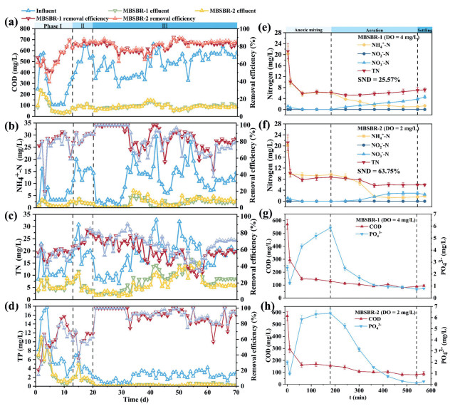 | Fig. 2. (a) COD, (b) NH4+-N, (c) TN and (d) TP removal efficiencies at different phases of MBSBR operated under different DO conditions. (e, f) Variations in the concentrations of nitrogen, COD and PO43− during a cycle under different DO conditions. | |