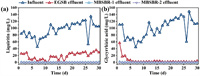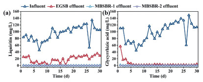 The dehydration wastewater from licorice residues used in this study contains typical components such as liquorice flavonoids, saponins, and polysaccharides. Specifically, liquiritin (LQ) belongs to dihydroflavonoids, while glycyrrhizic acid (GA) is classified as a saponin. The complex structures of both compounds have been discovered to inhibit microbial activity [25]. Therefore, it is crucial to investigate the longitudinal degradation trends of these two typical pollutants. As shown in the Fig. 3, the average influent concentrations of LQ and GA were 94.46 mg/L and 98.87 mg/L, respectively. The Mi-EGSB achieved removal rates of 80.74% for LQ and 94.07% for GA, with GA being nearly undetectable in the Mi-EGSB effluent during the stabilization phase. Furthermore, sequential batch experiments revealed hydrolysis rates of 16.743 and 18.732 mg L−1 h−1 for LQ and GA by microaeration sludge, respectively, indicating rapid degradation of GA when relevant hydrolases were expressed by microorganisms (Fig. S1 in Supporting information). It is noteworthy that GA, as a plant-based natural surfactant, has the potential to generate bubbles during reflux aeration and reduce the efficiency of oxygen dissolution [26]. However, oxygen mass transfer was facilitated by efficient degradation in the Mi-EGSB. Both components were undetectable in MBSBR effluent, indicating the effective degradation of typical pollutants through the combined process.