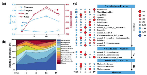 | Fig. 4. (a) Changes in microbial community diversity and richness in Mi-EGSB during different phase. (b) The relative abundance changes of microbial community at phylum level in different phases of operation in Mi-EGSB. (c) Heatmap of microbial community at genus level with average abundance ranking in the top 20 in Mi-EGSB. | |