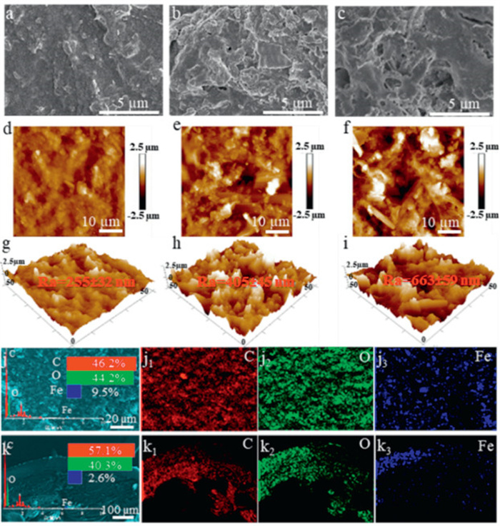 | Fig. 3. Morphological characterization. (a-c) SEM of GDM1, GDM2, and GDM3. (d-f) AFM 2D image of GDM1, GDM2, and GDM3. (g-i) AFM 3D image of GDM1, GDM2, and GDM3. (j) Surface EDS of GDM3, (k) cross-section EDS of GDM3. | |