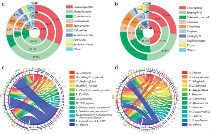 In the phylum, Planctomycetota, Proteobacterial, and Cyanobacteria were the dominant bacterial phylum in GDM systems (Fig. 4a). Planctomycetota was the most abundant species in three GDM systems, accounting for 38.2%, 32.7% and 32.3% in GDM1, GDM2, and GDM3. Proteobacterial was relevant to pollutant removal since they included various functional bacteria for the biodegradation of organic pollutants [25]. The more abundant Proteobacterial in GDM2 (38.1%) and GDM3 (33.3%) contributed to the effective removal of organic pollutants than in GDM1 (26.8%). Besides, GDM1 had a higher Cyanobacteria percentage (16.2%) than GDM2 (5.2%) and GDM3 (7.9%). In the GDM system, alga breeding restricted other microorganisms' growth within the biocake layer and promoted more secretions released by microorganisms [26]. Thus, the relatively low Cyanobacteria ratios in GDM2 and GDM3 contributed to reducing microbial secretion, consistent with the analytical results of EPS and SMP, conducive to mitigating the membrane fouling.