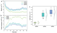 | Fig. 1. Flux and resistance developments of GDM systems. (a) Flux variation, (b) total resistance, and (c) stable flux. Capital letters represent the significant difference analyzed by post hoc Tukey's test (P < 0.05). | |