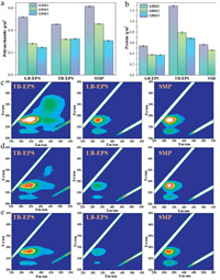 | Fig. 2. Biomass analysis: (a, b) Polysaccharide and protein in the biocake layer. (c-e) The fluorescent pollutant of EPS and SMP in GDM1, GDM2, and GDM3, respectively. | |