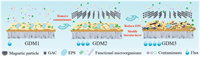 Besides, the flux level was another factor to impacted the extensive application of GDM technology, which was closely related to the structural characteristics of the biocake layer [11]. The formed biocake layer on the membrane surface without any interventions became dense and flat, resulting in severe membrane fouling and low membrane flux. Many scholars have made efforts hoping to engineer a rough, heterogeneous, and porous biocake layer beneficial to GDM flux improvement [5]. In-situ modification of the biocake layer is an effective measure to alleviate membrane fouling and enhance the membrane flux of the GDM system. A previous report suggested that pre-coating manganese oxides on the membrane surface of GDM system engineered heterogeneous biocake structures and the stable flux improved by 20% [12]. Another study found that depositing larger particles on the membrane surface helped to form a more heterogeneous and permeable biocake layer structure, which was beneficial to alleviate membrane fouling [13]. In recent years, magnetic particles as a fouling reducer were introduced to the membrane bioreactor (MBR) to control the membrane fouling due to their advantages of magnetobiological effects and easy separation [14]. Magnetic particles could affect the MBR microbial community structure, to reduce the pioneer bacteria from bulk sludge and result in less SMP production [14]. Another report even pointed out that magnetic particles selectively enhanced the organic substances' degrading bacteria growth and decreased the ratio of bacteria related to membrane fouling [15]. It was inferred that introducing magnetic particles into the GDM would probably produce an effect on GDM membrane fouling. However, the effects of magnetic particles on the biocake layer properties and GDM performance were still unclear. Furthermore, the previous studies mainly focused on the single pretreatment or biocake layer modification, and there was no report on the combined effects of magnetic particles and GAC, and their respective role in the GDM performance was not clearly expounded.