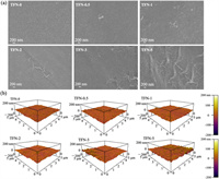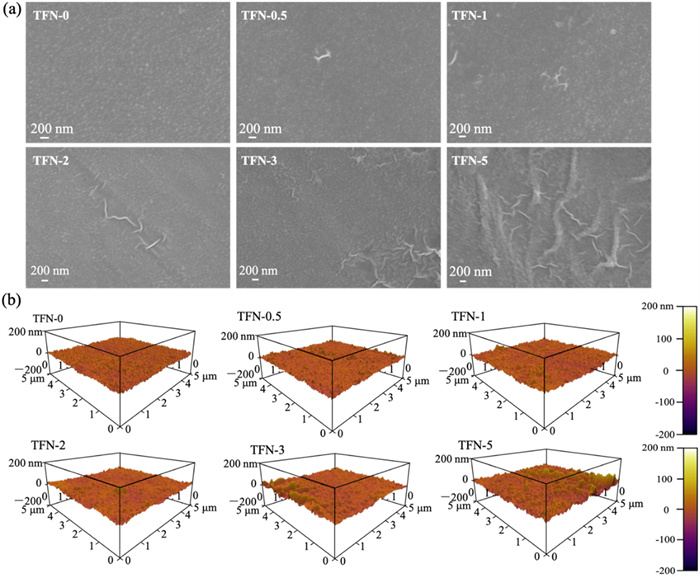 | Fig. 2. The morphological characterization of membranes. (a) The SEM and (b) AFM images of the surface of the control TFC membrane and MoS2-incorporated TFN membranes fabricated on UP150 substrates. | |