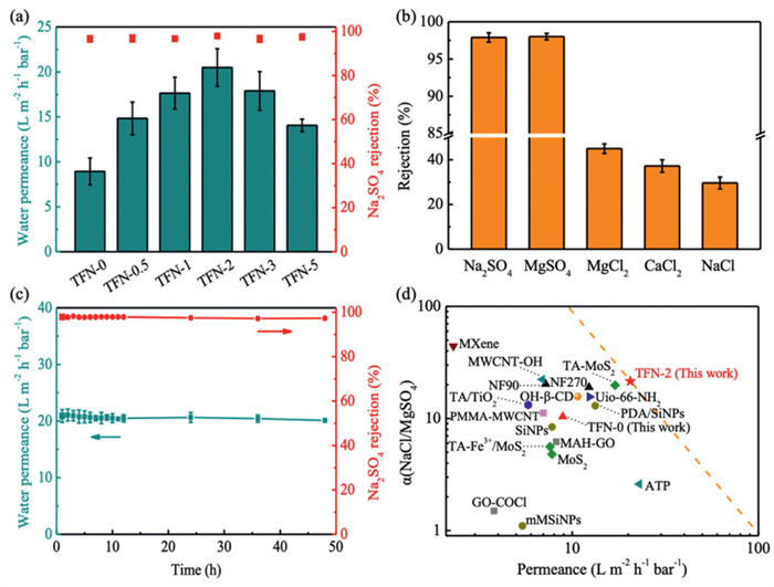 | Fig. 3. Performance analysis of the MoS2-incorporated TFN membranes. (a) A comparison of water permeance and Na2SO4 rejection tested with 1000 mg/L of Na2SO4 at 5 bar. (b) Comparison of salt rejection for TFN-2 membrane using different salts, namely, Na2SO4, MgSO4, MgCl2, CaCl2, or NaCl at 5 bar. (c) Long-term filtration performance of TFN-2 membrane for Na2SO4 rejection at 5 bar. (d) A comparison of water permeance and Na2SO4 rejection of the optimal MoS2-incorporated TFN membrane (TFN-2) with other nanomaterials-incorporated TFN membranes is discussed in Table S3. | |
