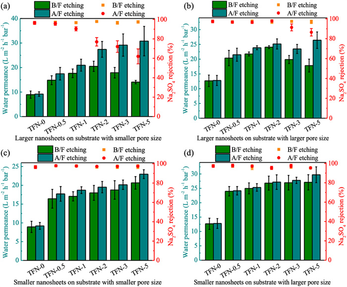 | Fig. 4. Comparison of the separation performance of MoS2-incorporated TFN membranes with various-sized nanosheets on different pore-size substrates before (B/F) and after (A/F) H2O2 etching. MoS2-incorporated TFN membranes were prepared on small pore size substrates (UP150) with large (a) and small (b) MoS2 nanosheets exfoliated at 25 ℃ and 200 ℃, respectively, and on large pore size substrates (MF0105) with large (c) and small (d) MoS2 nanosheets. | |