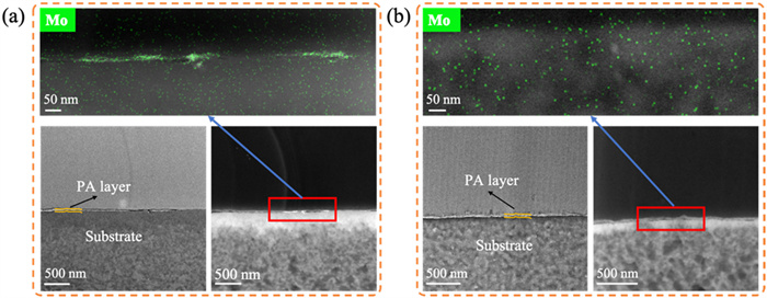 The TEM cross-sectional views and HAADF images (Fig. 5 and Fig. S16 in Supporting information) displayed the independent existence of the substrate and the PA layer in TFN-5 membranes prepared with large and small MoS2 nanosheets on smaller pore-sized (UP150) and larger pore-sized (MF0105) substrates. Based on the corresponding elemental map, the TFN-5 membrane prepared with large MoS2 nanosheets exhibited the accumulation of Mo on the substrate (green part in Fig. 5a and Fig. S16a), implying the stacking or aggregation of MoS2 nanosheets. However, the elemental map of Fig. 5b and Fig. S16b showed no dense distribution of Mo in the TFN-5 membrane prepared with small MoS2 nanosheets, indicating their uniform distribution and minimal loading within the membrane. The actual amount of MoS2 integrated into the TFN membrane was determined by measuring the Mo4+ concentration after H2O2 etching (Fig. S17 in Supporting information). TFN membranes with smaller MoS2 nanosheets demonstrated a steady rise in the actual content of MoS2, with those prepared on the substrates with larger pores (MF0105, ~200 nm) having slightly higher MoS2 loading compared to those on the substrates with smaller pores (UP150, ~50 nm). This could be attributed to the smaller MoS2 nanosheets being well dispersed in the hydration layer and pores of UP150 and MF0105 substrates (Fig. 5b and Fig. S16b). Compared to the UP150 substrate, the MF0105 substrate's larger pores acted as a more excellent reservoir for amine monomers and MoS2 nanosheets (Fig. S16a). A significant increase in Mo concentration was observed for the TFN membranes incorporated with larger MoS2 nanosheets, particularly between TFN-3 and TFN-5 (Fig. 5a, Figs. S16a and S17). The irregular growth indicated a change in the distribution of MoS2 nanosheets, possibly due to MoS2 aggregation [55]. Remarkably, despite the similar Mo loading observed for TFN membranes prepared on substrates with larger or smaller pores, such as TFN-2 and TFN-3 membranes (Fig. S17), they exhibited distinct impacts on the separation performance, particularly on rejection after etching (Fig. 4). This finding highlights the significant influence of substrate pore size and nanosheet size on aggregation, which helps address the decrease of water permeance in TFN membranes with high loading nanosheets.