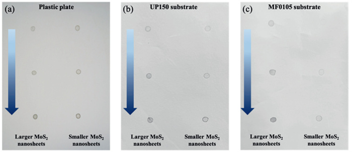 | Fig. 6. Distribution of large and small MoS2 nanosheets on different substrate surfaces: (a) Impermeable plastic plate, (b) UP150 substrate (small pore size), and (c) MF0105 substrate (large pore size). The left side of each image represents 10 µL droplets of larger MoS2 nanosheets, while the right side shows 10 µL droplets of smaller MoS2 nanosheets. From top to bottom, the concentrations of MoS2 nanosheet in the droplets were 0.06 g/L, 0.1 g/L, and 0.2 g/L, respectively. | |