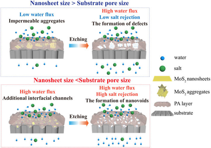 Drawing from the separation performance observed in MoS2-incorporated TFN membranes (Fig. 4), the actual Mo loading (Fig. 5), and the characterization of MoS2 nanosheets on the different substrates (Fig. 6, Figs. S18 and S19 in Supporting information), a conceptual representation of the underlying mechanism is proposed in Fig. 6. When MoS2 nanosheets are incorporated on substrates with a pore size smaller than the nanosheets, aggregation becomes more likely within the TFN membranes (Fig. 7 and Fig. S18a). The nanosheets cannot enter the substrate pores and fail to disperse effectively in the substrate's thin hydration layer, forming impermeable aggregates that reduce water permeance with higher concentrations of MoS2 nanosheets. Moreover, etching away these aggregates disrupts the PA layer's continuity, leading to a decrease in salt rejection (Figs. 4a and b). In contrast, using a substrate with pore sizes exceeding that of the MoS2 nanosheets' dimensions helps prevent aggregation (Fig. 7). The larger substrate pores allowed the smaller MoS2 nanosheets to enter and disperse within the membrane, preventing significant aggregation. After etching, the continuity of the PA layer remained intact, and numerous nanocavities appeared within the PA layer. The nanocavities created by etching improved water permeability while preserving salt rejection (Figs. 4c and d). Overall, the substrate's pore size and the MoS2 nanosheets' particle size play crucial roles in controlling aggregation and optimizing the separation performance of TFN membranes.
