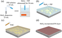 | Fig. 1. The schematic illustration of MoS2-incorporated TFN membrane fabrication. (a) Different amounts (0.5, 1, 2, 3, and 5 mg) of MoS2 nanosheets were mixed with PIP/H2O solution and then sonicated for 30 min to ensure an even distribution; (b) the mixed solution was applied to the substrate; (c) TMC/hexane solution was added to the MoS2/PIP-treat substrate; (d) the formation of MoS2-incorporated PA layer. | |