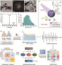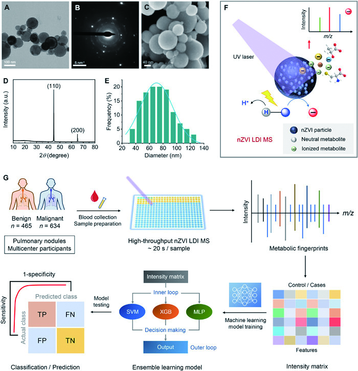 | Fig. 1. Nano-zero-valent iron (nZVI)-assisted LDI MS platform for serum fingerprinting and diagnosis of pulmonary nodules. (A) Transmission electron microscopy (TEM) image of nZVI particles. (B) Selected area electron diffraction (SAED) pattern of nZVI particles showing crystalline structure. (C) Scanning electron microscope (SEM) image of nZVI particles. (D) X-ray diffraction (XRD) pattern of nZVI particles. (E) Particle size distribution of the nZVI particles. (F) Schematic of the nZVI-assisted LDI MS analysis of metabolites in negative ion mode. (G) Workflow for the diagnosis of patients with benign and malignant pulmonary nodules using the nZVI-assisted LDI MS and machine learning. | |