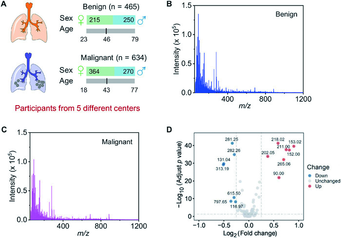 | Fig. 2. nZVI-assisted MS analysis of serum metabolites in patients with benign and malignant pulmonary nodules. (A) Gender and age information of benign and malignant pulmonary nodule cohorts. nZVI-assisted mass spectra of a randomly selected serum sample from patient with (B) benign and (C) malignant pulmonary nodules. (D) Volcano plot showing metabolites with significant differences in serum samples from patients with benign and malignant pulmonary nodules. | |