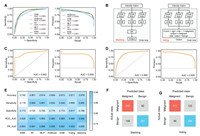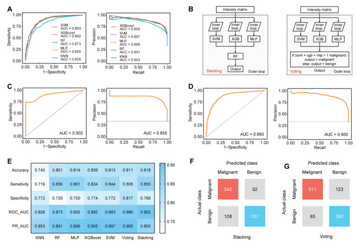 | Fig. 3. Diagnosis of benign and malignant pulmonary nodules by machine learning with serum metabolic fingerprints. (A) ROC and PR curves of five separate machine learning models. (B) Schematic workflows of the stacking and voting models with five-fold nested cross-validation, including the inner loop to tune the optimized hyperparameters of each separate classifier and the outer loop to evaluate the performance of the models. (C) ROC and PR curves of the developed stacking learning model. (D) ROC and PR curves of the developed voting learning model. (E) Performance metrics of five separate machine learning models and two ensemble learning models. (F, G) Confusion matrices of the stacking and voting models for the classification of benign and malignant pulmonary nodules. | |