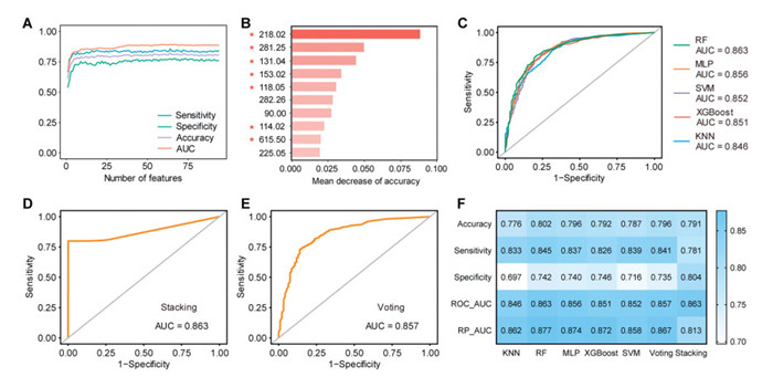 | Fig. 4. Diagnosis of benign and malignant pulmonary nodules by machine learning with serum metabolic biomarker panel. (A) Changes of the performance metrics with the numbers of feature used in XGBoost model for the classification of pulmonary nodules. (B) Top 10 ranked importance features for classifying benign and malignant pulmonary nodules. Features marked with red asterisks are the final seven metabolic biomarkers selected. (C) ROC curves of five separate machine learning models. (D, E) ROC curves of the stacking and voting models. (F) Performance metrics of five separate machine learning models and two ensemble learning models using the seven metabolic biomarkers. | |