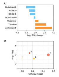 | Fig. 6. Fold changes of the seven biomarkers and potential pathways alteration. (A) Fold changes of four down-regulated metabolites (blue) and three up-regulated metabolites (orange) in serum of participants with malignant pulmonary nodules compared with those with benign pulmonary nodules. (B) Potential pathways differentially regulated in benign and malignant pulmonary nodule groups. The seven selected metabolites were tested to identify altered pathways. The color and size of each circle were correlated to the P values and pathway impact values, respectively. A total of three pathways were considered as altered (P < 0.05, pathway impact value > 0.1): (1) phenylalanine, tyrosine and tryptophan biosynthesis, (2) alanine, aspartate and glutamate metabolism, and (3) tyrosine metabolism. | |
