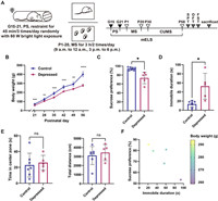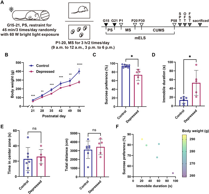 | Fig. 1. Depressive-like behavior induced by mELS in young adult rats. (A) Flow chart of model construction for the depressive-like behavior induced by mELS. Body weight and behavioral assessment: (B) Body weight of offspring, (C) sucrose consumption rate in sucrose preference test, (D) immobile duration in forced swimming test, (E) time spent in the center zone and total distance traveled in the whole area in open field test. (F) The chosen of depressed rat that underwent MALDI-MSI. Error bars indicated standard deviation (n = 7 in control group and n = 5 in depressed group). *P < 0.05, **P < 0.01, ***P < 0.001, ****P < 0.0001, ns, no significance. G, gestational day; P, postnatal day; PS, prenatal stress; MS, maternal separation; CUMS, chronic unpredictable mild stress. | |