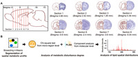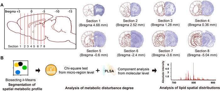 | Fig. 2. Eight brain sections underwent MALDI-MSI scanning and analysis. (A) Location of sections based on the Rat Brain Atlas (left hemisphere of the brain section picture) and histomorphological analysis based on Nissl staining (right hemisphere of the brain section picture). Distances to bregma were marked below each section. (B) Data processing of MALDI-MSI in each brain section including the segmentation analysis, chi-square test, PLSA and analysis of lipid spatial distributions. | |