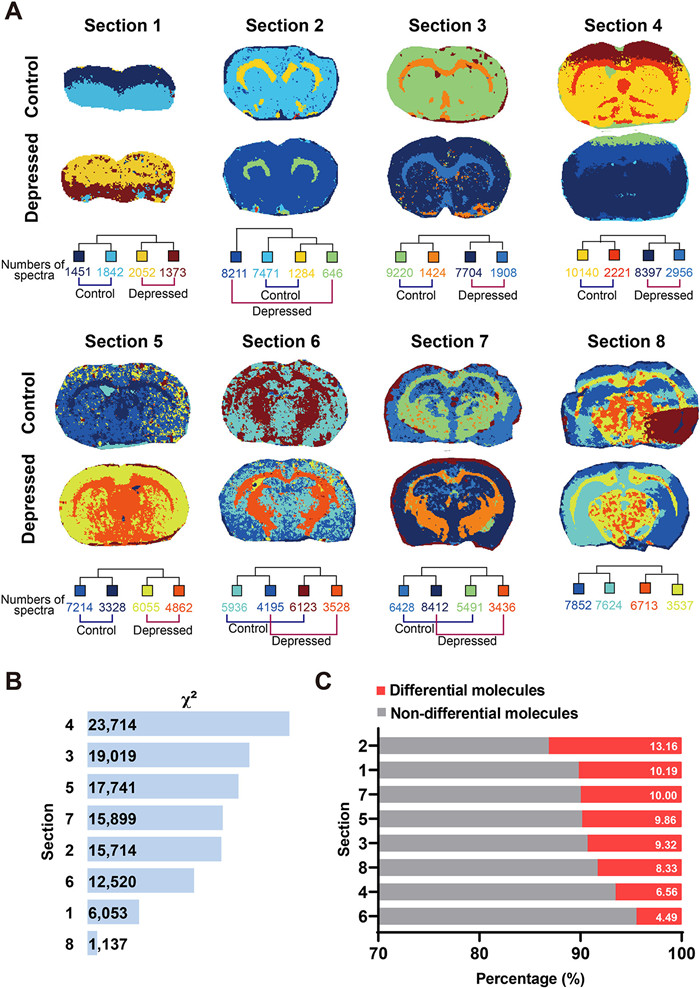 Subsequently, probabilistic latent semantic analysis (PLSA) with a 95% confidence interval was conducted on each pair of brain sections with three principal components (Fig. 2B and Table S1). Numerous molecules with significantly different expressions were achieved to reveal the spatial metabolic heterogeneity between control and depressed rats from molecular level. Firstly, we assessed the proportion of differential molecules between each pair of sections in relation to the total number of detected molecules, to obtain a deeper understanding of the extent of variation in different brain sections from depressed rat compared to control rat. The orders of differential molecule percentages from highest to lowest were the section 2 (13.16%), section 1 (10.19%), section 7 (10%), section 5 (9.86%), section 3 (9.32%), section 8 (8.33%), section 4 (6.56%), and section 6 (4.49%) (Fig. 3C). Together, the most severe metabolic disturbance in depressed rat, in descending order of degree, were the section 7, 5, 2, 3, 4, 1, 6 and 8 in paired brain sections according to the chi-square test and component analysis.
