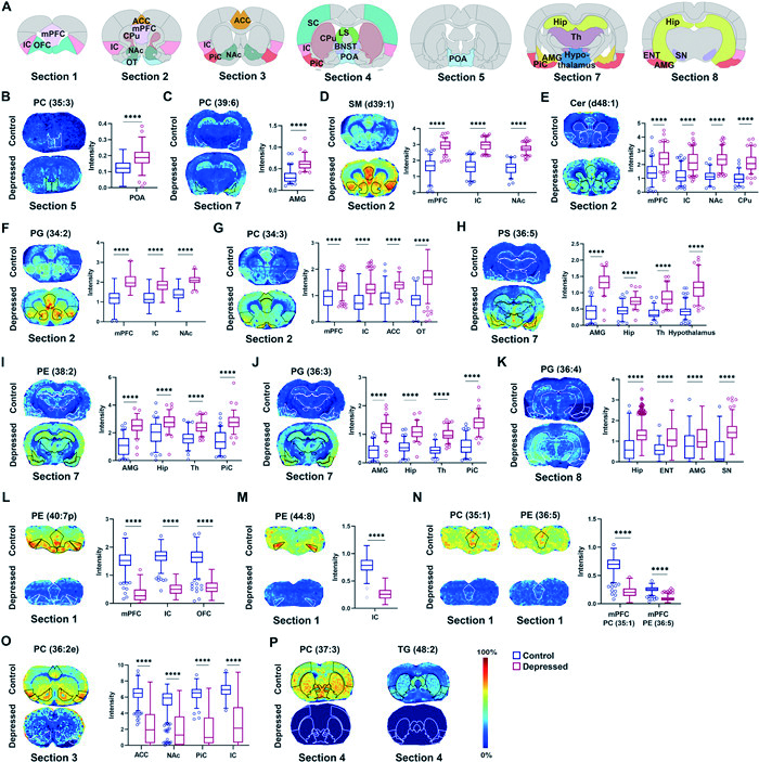 | Fig. 4. Variations of lipids on spatial distribution patterns in control and depressed rats. (A) Schematic diagrams of brain sections and regions according to the functional magnetic resonance atlas of rat brain and the Rat Brain Atlas. (B-P) Spatial distributions of lipids. All differences were depressed versus control rat. The brain regions of interest were delineated by the black or white line in depressed or control rat, respectively. **** P < 0.0001. In addition, there was no expression in PC (37:3) and TG (48:2) from depressed rat. The fold changes of PC (37:3) and TG (48:2) were not available between control and depressed rats. Abbreviates of brain regions were as follows: POA, preoptic area; AMG, amygdala; mPFC, medial prefrontal cortex; IC, insular cortex; NAc, nucleus accumbens; CPu, corpus striatum; ACC, anterior cingulate cortex; OT, olfactory tubercle; Hip, hippocampus; Th, thalamus; PiC, piriform cortex; Ent, entorhinal cortex; SN, substantia nigra; OFC, orbitofrontal cortex; SC, sensory cortex; BNST, bed nucleus of the stria terminalis; LS, lateral septum. | |