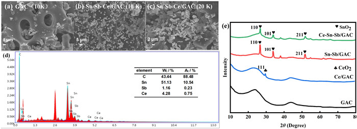 | Fig. 1. (a) SEM of GAC (10 K). (b) SEM of Sn-Sb-Ce/GAC (10 K). (c) SEM of Sn-Sb-Ce/GAC (20 K). (d) EDS of Sn-Sb-Ce/GAC particle electrode. (e) XRD pattern of particle electrode. | |