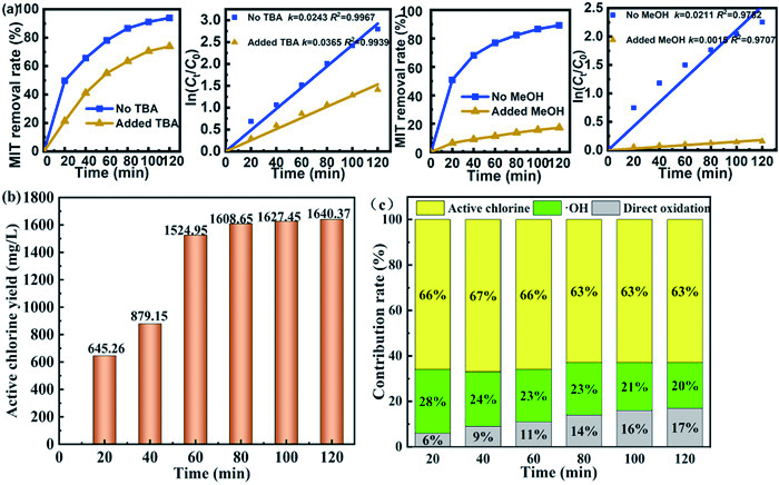 As can be seen from Fig. 2a, the treatment efficiency of the system was greatly reduced after the MeOH was added. After 120 min of electrocatalytic degradation, the removal rate of MIT was only 17.2%, indicating that the direct oxidation contribution of the system was 17.2%. At the same time, the reaction rate constant of the system without MeOH was 14 times that of the system with MeOH. In addition, the reaction rate of direct oxidation increases gradually, indicating that the degradation of pollutants by the anode is relatively stable, and the treatment efficiency does not fluctuate greatly.