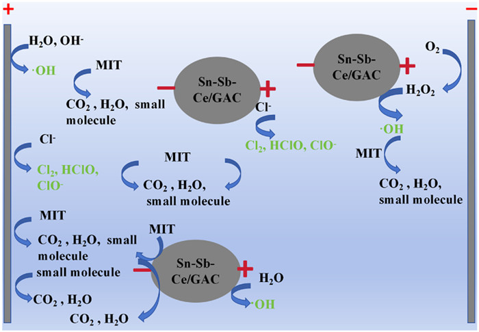 To sum up, the degradation of MIT may have the following situations: Firstly, MIT can be directly oxidized and degraded on the anode plate. Secondly, the •OH and active chlorine (HClO) generated near the anode plate can oxidize and degrade MIT indirectly. Thirdly, the Sn-Sb-Ce/GAC particle electrode directly degrades MIT after repolarization. Finally, the •OH and active chlorine (HClO) generated by the depolarization of the Sn-Sb-Ce/GAC particle electrode indirectly oxidizes and degrades MIT (Fig. 3).
