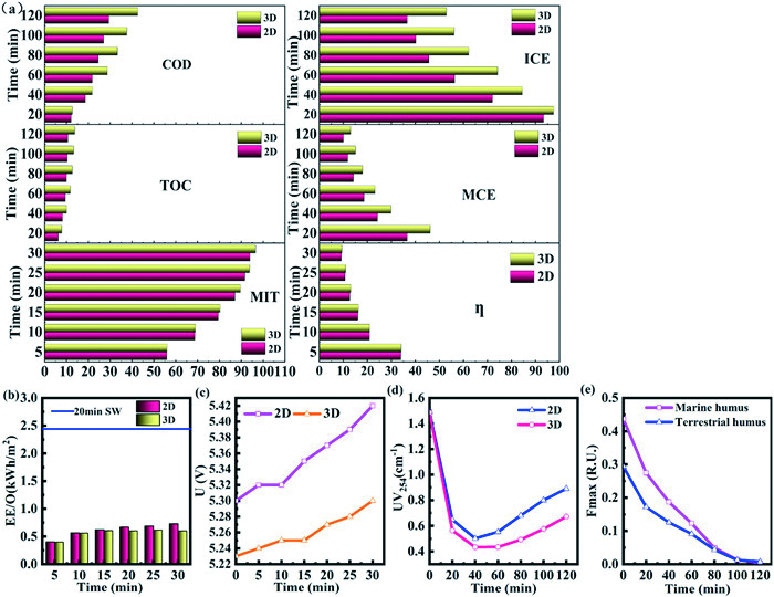 | Fig. 4. 2D and 3D performance analysis of ROC water. (a) COD, TOC, MIT removal rate and ICE, MCE, ƞ. (b) EE/O. (c) The cell voltage. (d) UV254. (e) Humus degradation. The 3D electrode system reaction condition [MIT] = 50 mg/L, current density = 20 mA/cm2, initial pH 5, [Na2SO4] = 0.2 mol/L, particle electrode is 5 g/L. The 2D electrode system has the same reaction conditions as the 3D electrode except that there are no particle electrodes. | |