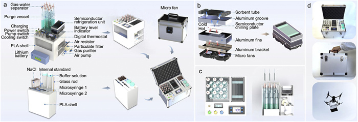 The µP&T device consists of two integrated modules: A main module and an accessory module (Fig. 1a). The two modules are assembled using two PLA shells (Figs. S1 and S2 in Supporting information) designed in SolidWorks and printed by a 3D printer and integrated into an aluminum alloy suitcase (315 mm × 208 mm × 260 mm). The main module mainly consists of a µP&T unit and a semiconductor refrigeration unit. The µP&T unit is composed of a miniature air pump (3 W), an air particulate filter, a gas purifier filled with 10 g of styrene divinylbenzene copolymer and activated carbon, an air resistor, 50 mL gas wash purge vessels, quartz sorbent tubes (110 mm length × 2 mm i.d. × 3 mm o.d.) and gas-water separators. Nine 50-mL gas wash purge vessels are positioned in a 9-position sample tray, capable of pretreating nine water samples simultaneously (Fig. 1c). The semiconductor refrigeration unit consists of a semiconductor chilling plate (TEC1-12706a, 21.7 W, 40 mm × 40 mm), an aluminum groove, an aluminum fin block, an aluminum bracket and two micro fans (Fig. 1b). The aluminum groove attached to the cooling side of the semiconductor chilling plate is utilized as a cooling block for the cold preservation of sorbent tubes. The aluminum fin block, affixed to the heat-dispersing side of the plate, facilitates heat dissipation in conjunction with the micro fans. Additionally, a vent was designed at the back of the suitcase, near the semiconductor refrigeration unit, and incorporates a fan to enhance airflow with the external environment, thereby improving heat dissipation. The temperature is controlled by a digital thermostat. A rechargeable 20000 mAh lithium battery (12 V) serves as the power source. The power level is monitored by an indicator and can be recharged via the charging port. Three switches are used to control the main power supply, the air pump, and the semiconductor refrigeration unit, respectively. The accessory module consists of NaCl bags, pH buffer solution tubes, internal standard vials, a glass rod and two micro syringes. The entire device weighs 3 kg and can be easily carried by hand or drone (DJI, M300RTK) (Fig. 1d).