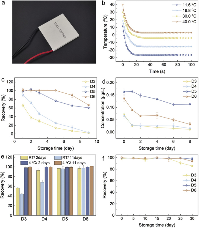 | Fig. 2. (a) Photograph of the semiconductor chilling plate. (b) The temperature profile of the cooling block. (c) A wastewater sample stored directly at room temperature. (d) A spiked standard solution stored directly at ambient temperature. (e) The effects of storage temperature and time on the recoveries of VOCs stored by the proposed method. (f) The stability of VOCs stored at 4.0 ℃ by the proposed method. | |