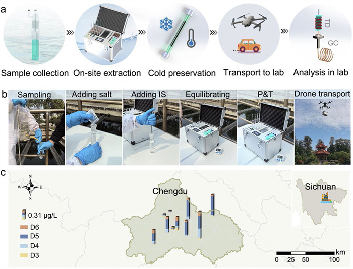 | Fig. 3. (a) The overall workflow for detecting target VOCs. (b) Photographs of on-site application of the µP&T device (IS, internal standard). (c) Spatial distribution of VOCs detected in WWTP influents. | |