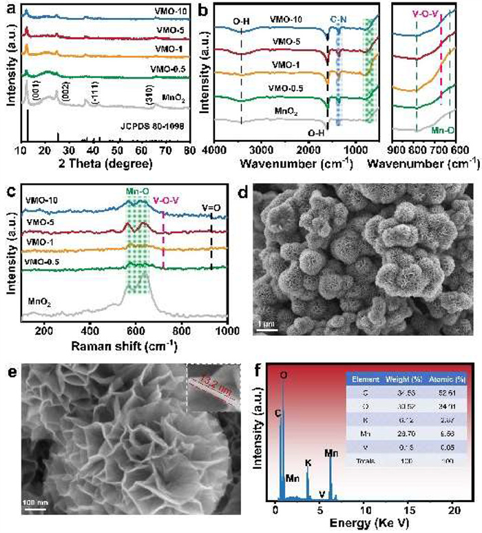 To investigate the influence of vanadium ions doped on the structural properties of MnO2, Raman spectra were presented within the range of 200−1000 cm−1 (Fig. 1c). The doped vanadium changed the interlayer environment of MnO2 and reduced the Mn−O bonds coordination at 570 and 640 cm⁻¹, which had a significant inhibitory effect on Jahn−Teller. Additionally, the lengthened the Mn−O bonds in VMO-5 indicated enhanced electrochemical performance [27,33]. Furthermore, weak stretching vibrations corresponding to the V−O−V and V=O bonds were identified at 719 and 930 cm−1 respectively, these findings were consistent with the FTIR results [31,34]. In conclusion, the faint signals related to vanadium-related groups found by the FTIR and Raman spectroscopy confirmed the successful doping of trace vanadium.