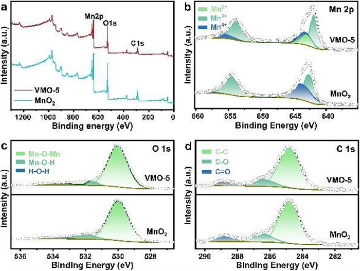 | Fig. 2. (a) XPS full spectrum of VMO-5 and MnO2. (b) Mn 2p, (c) O 1s, and (d) C 1s XPS spectrum of VMO-5 and MnO2. | |