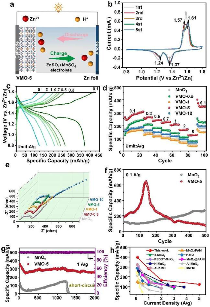 | Fig. 3. (a) Schematic diagram of AZIBs with zinc foil as anode and VMO-x as the cathode. (b) CV curves of VMO-5 at a scanning speed of 0.1 mV/s. (c) GCD curves of VMO-5 at a current density of 0.1−5 A/g. (d) Rate performance of MnO2 and VMO-x. (e) EIS spectra of MnO2 and VMO-x. (f) Cyclic performance of MnO2 and VMO-5 at a current density of 0.1 A/g. (g) Cyclic performance of MnO2 and VMO-5 at a current density of 1 A/g. (h) Performance Ragone diagram of VMO-5 and other types of cathode materials for AZIBs. | |
