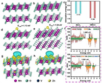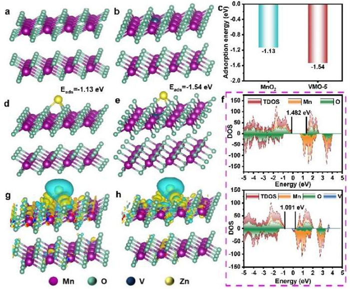 | Fig. 5. DFT calculation configuration diagram: (a) MnO2, (b) VMO-5. (c) The adsorption energies of Zn2+ in MnO2 and VMO-5. Eads of Zn2+ in (d) MnO2 and (e) VMO-5. (f) The density of states (DOS) of MnO2 and VMO-5. The differential charge density distribution of Zn2+ in (g) MnO2 and (h) VMO-5. | |