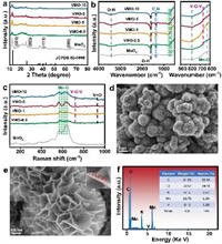 | Fig. 1. (a) XRD of VMO-x. (b) FTIR spectra of VMO-x. (c) Raman spectra of VMO-x. (d, e) SEM of VMO-5 at 1 µm and 200 nm scales. (f) SEM–EDX of VMO-5. | |
